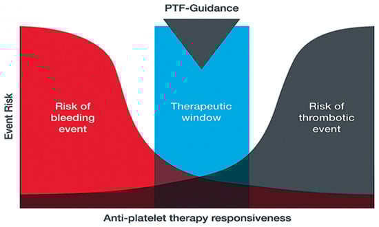 The TEG® PlateletMapping® assay simultaneously provides insight into baseline platelet function status via the kaolin maximum amplitude (MA) (i.e., the patient’s maximal platelet function in the absence of the inhibiting drugs), alongside the current response to P2Y12 receptor inhibitors and cyclooxygenase-1 (COX-1) inhibitors via the ADP and the AA tests, respectively (i.e., demonstrating the clot strength when platelets are activated solely through those specific receptors) (Figure 2). The kaolin MA has shown the ability to identify patients at increased risk of adverse events independent of ADP and AA-induced response and may be a potential screening tool to uncover patients who would benefit from enhanced therapy or closer monitoring [38,40]. Additionally, the kaolin MA could be used to navigate treatment decisions including choice of therapy, and escalation/de-escalation decisions [38]. Thus, assessing platelet function with TEG® PlateletMapping® could potentially help with clinical decision making in patients with PAD by providing comprehensive coagulation metrics that aid patient-centered thromboprophylaxis [41]. For example, in the context of PCI procedures, antiplatelet therapy de-escalation strategies guided by platelet function testing have been included in the guidelines for acute coronary syndrome patients undergoing PCI as an alternative approach to 12 months of potent platelet inhibition, especially for patients deemed unsuitable for sustained potent platelet inhibition [42]. A potential utility of the TEG® PlateletMapping® assay, therefore, is in monitoring an individual’s response to antiplatelet therapy to identify the ideal therapeutic window between the risks of bleeding and thrombosis (Figure 3).