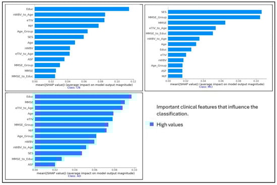 To enhance the explainability of the clinical component of the model, SHAP was applied to quantify the relative importance of individual features in predicting AD, MCI, and CN. This approach provides a transparent mapping between input variables and the model’s output, thereby addressing the clinical need for understanding why a particular diagnosis was made.