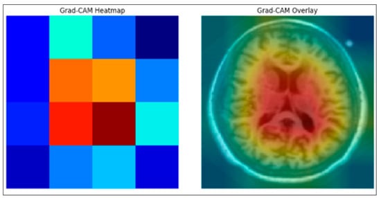Grad-CAM was applied to the MRI-based model to provide a visual explanation of the regions in the brain that contributed most to the classification. The feature extractor was based on a pre-trained ResNet50 model, and the last convolutional layer (conv5_block3_out) was selected to compute the Grad-CAM heatmaps.