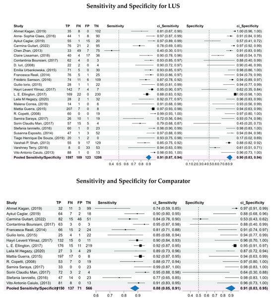 Forest plots of the sensitivity and specificity, log diagnostic odds ratios, and likelihood ratios for both LUS and comparators are provided for the articles included on the bivariate analysis. The forest plots were generated using the R library forestploter [34].