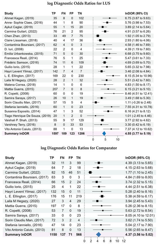 The pooled lnDOR for LUS was 4.55 (95% CI: 3.77–5.19), reflecting a strong association between positive LUS findings and pneumonia. The comparator lnDOR was slightly lower at 4.37 (95% CI: 3.56–5.02).