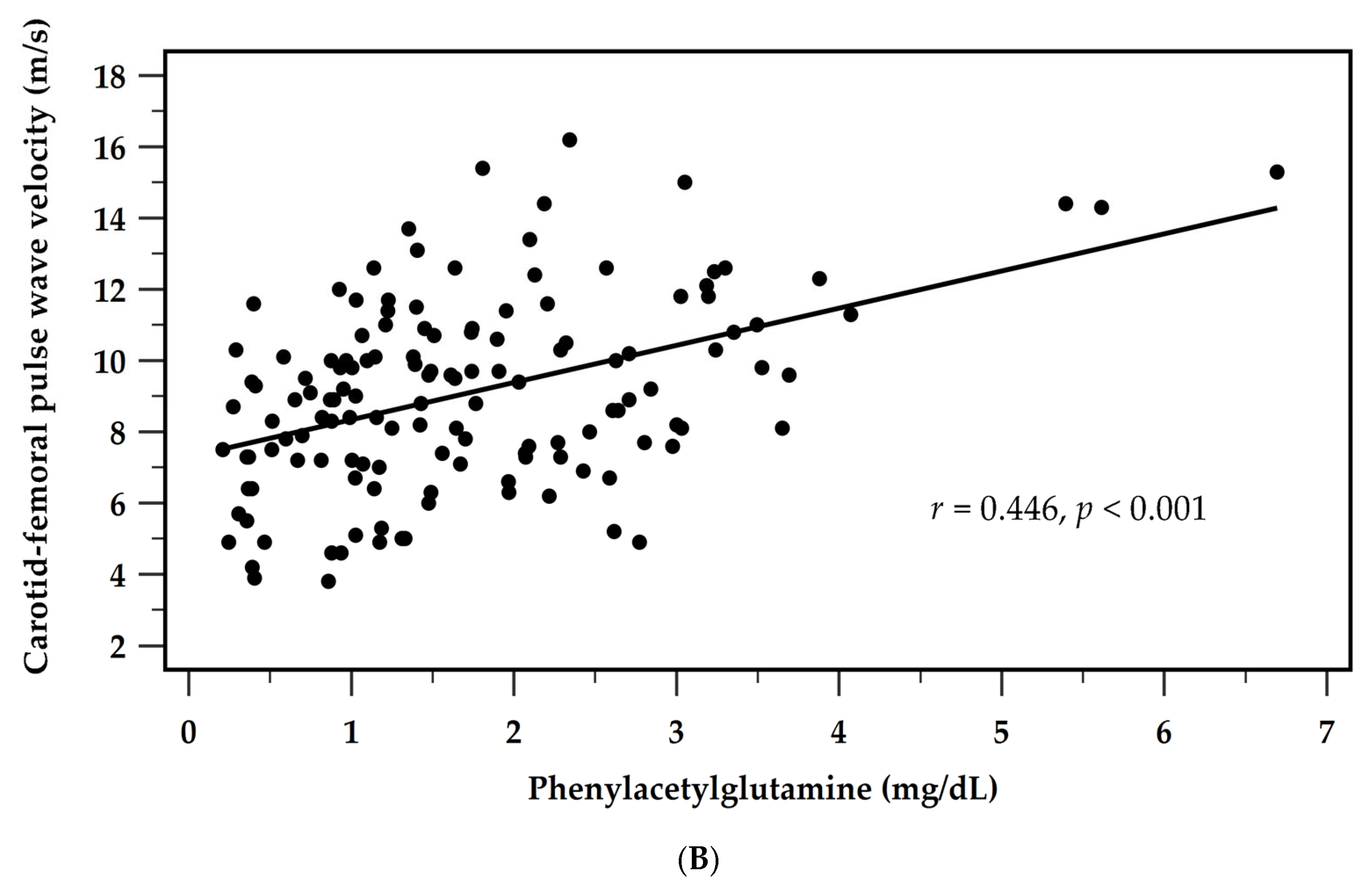 - Yang, H.-H.; Chen, Y.-C.; Ho, C.-C.; Hsu, B.-G. Serum Phenylacetylglutamine among Potential Risk Factors for Arterial Stiffness Measuring by Carotid–Femoral Pulse Wave Velocity in Patients with Kidney Transplantation. Toxins 2024, 16, 111. [Google Scholar] [CrossRef]