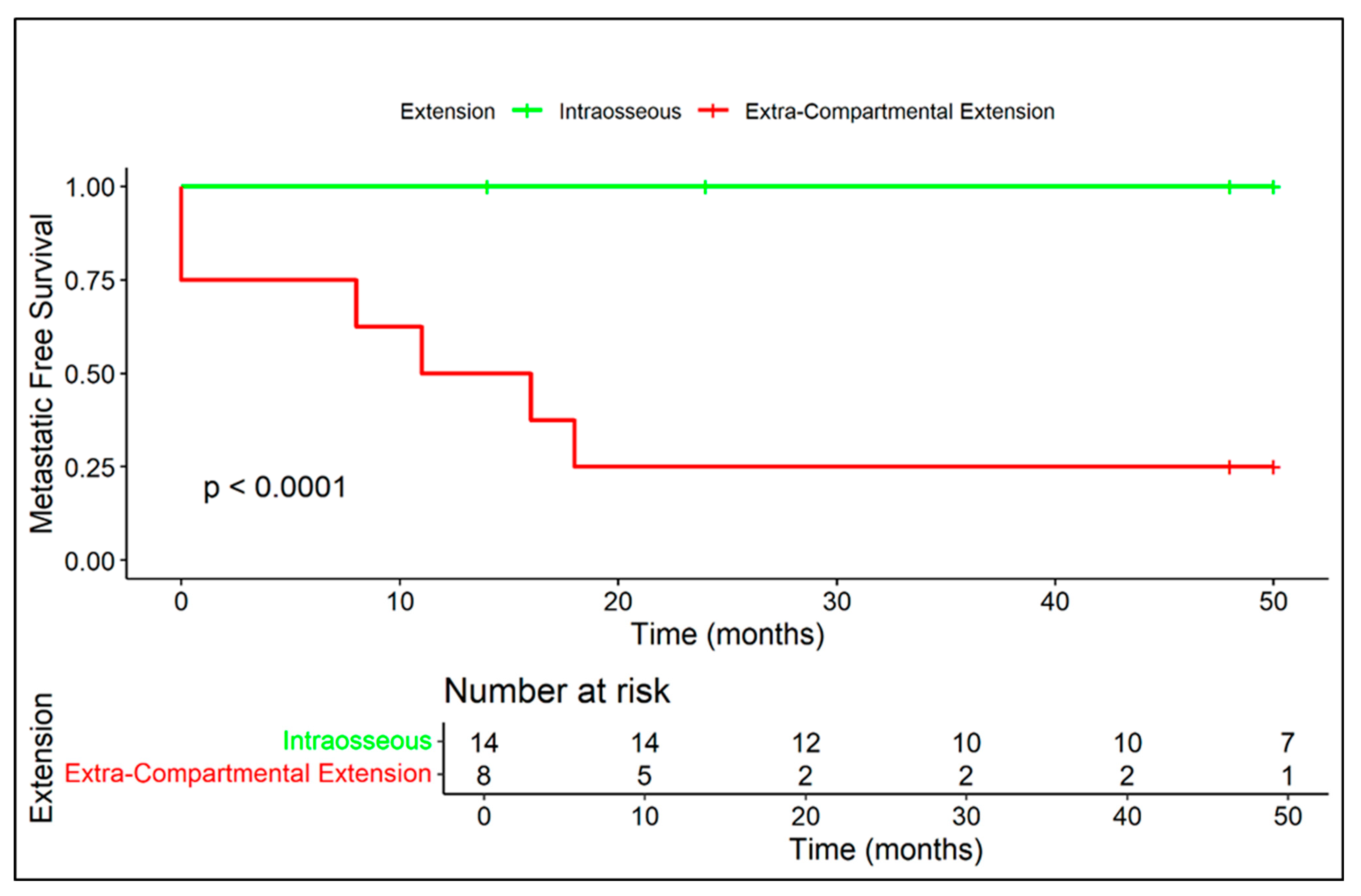 | Extra-intra osseus extension: Intraosseous only (0), intra- and extra-osseous (1) | Intraosseous only (14), Extra-osseous (2) | Intraosseous only (0), extra-osseous (6) | 0.0004 * |