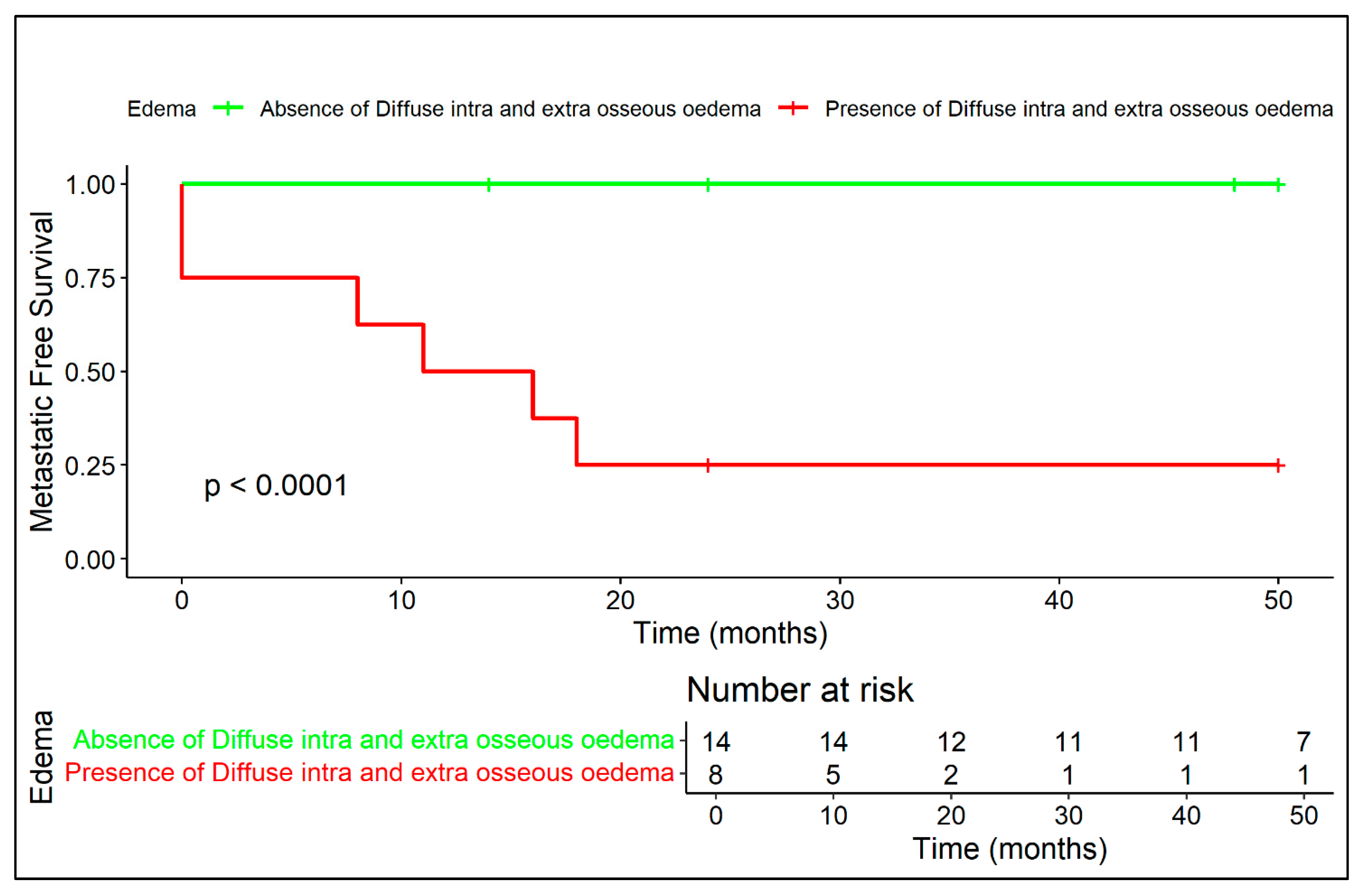 | Peritumoral edema: absent or focal (0), diffuse intra and extra-osseous (1) | Absent or focal (14), diffuse (2) | Absent or focal (0), diffuse (6) | 75.40 (3.15 to 1802.71) | 0.01 * |