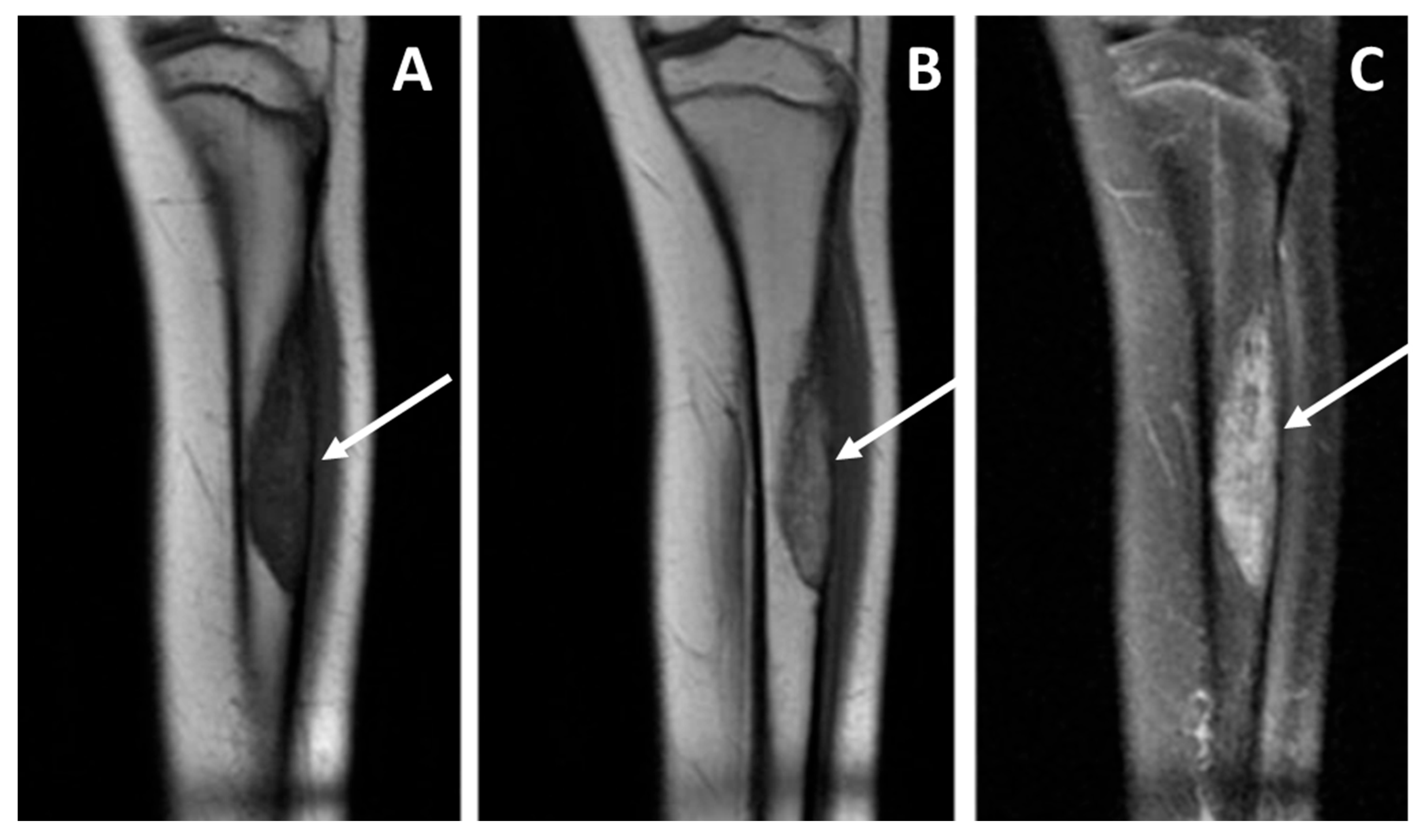 - MRI studies were performed on different equipment with high magnetic fields (1.5 Tesla or 3.0 Tesla system), using a standardized protocol that always comprised one T1-weighted imaging (WI), T2-WI with and without fat suppression (using Fat Sat, Short tau inversion recovery [STIR] or DIXON) and possibly at least one sequence of fat-suppressed T1-WI after contrast administration. At least two orthogonal acquisition planes were available for each patient.