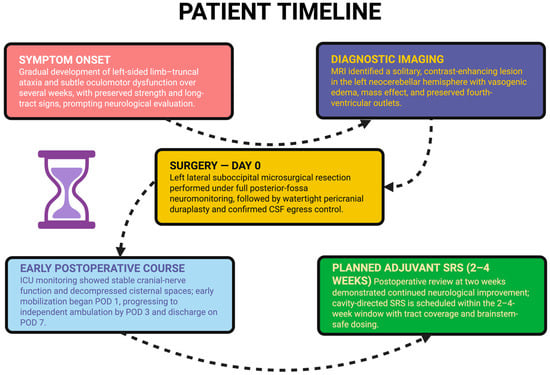A chronological summary of the patient’s course from symptom onset to planned adjuvant therapy, including initial neurological decline, diagnostic MRI, microsurgical resection, early post-operative recovery, and scheduling of cavity-directed stereotactic radiosurgery within the 2–4-week window.