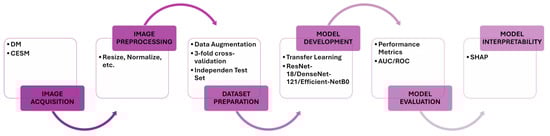 Proposed workflow. The diagram summarizes the key stages of this study, including image acquisition, preprocessing, data augmentation, model training, cross-validation, independent test evaluation, and SHAP-based interpretability. Identical procedures are applied to DM and CESM to ensure harmonized and comparable analyses.