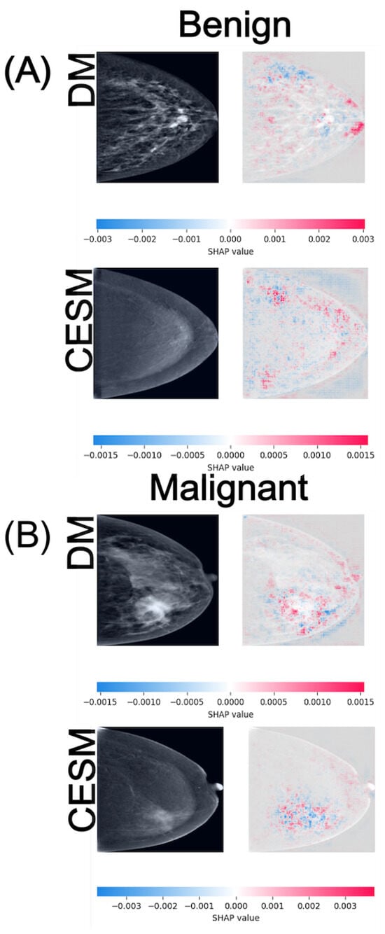 The interpretability results derived from SHAP further contextualize these quantitative findings. In both DM and CESM, the CNNs attend to anatomically coherent regions, primarily surrounding lesions or areas of contrast uptake. CESM produces sharper and more localized SHAP activations, consistent with contrast-driven delineation of vascularized tissue, whereas DM yields broader but still meaningful attention patterns focused on parenchymal structures. This alignment between modalities indicates that the models learn semantically relevant visual cues regardless of contrast enhancement. These consistent attribution patterns across modalities support the integration of SHAP-based interpretability as a quality-control step in clinical AI pipelines, ensuring that model predictions remain anatomically and pathophysiologically meaningful.