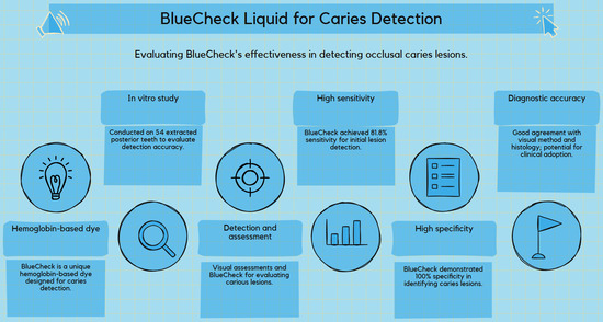12]. In that work, Caries Finder and BlueCheck were compared to assess whether they were substantially equivalent in visualizing demineralized dentin and to evaluate their performance relative to traditional visual/tactile detection. The results indicated that both adjunctive methods compared favorably with the conventional approach and showed comparable performance in differentiating carious dentin from sound tooth structure in vitro.