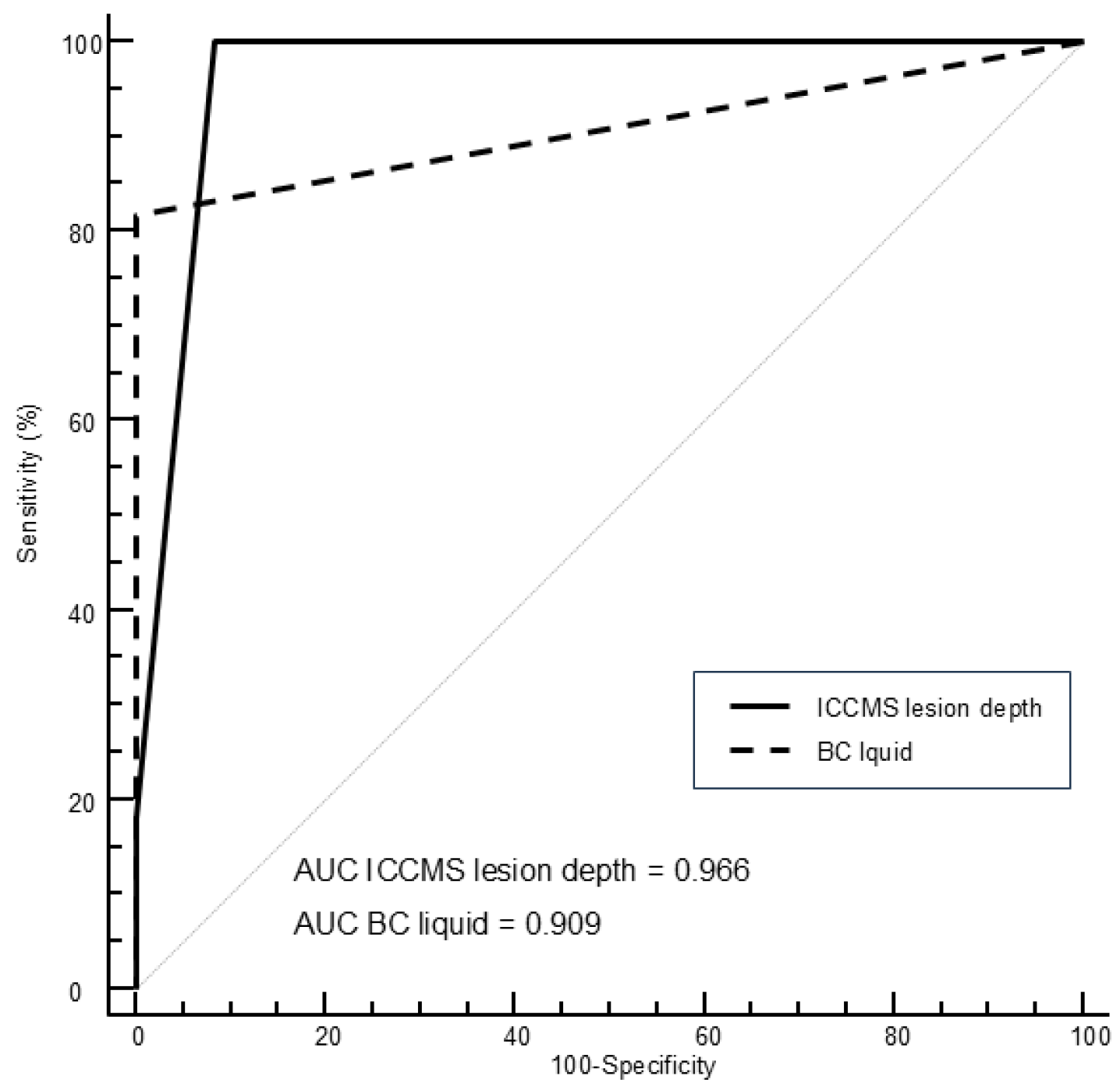 Figure 3 shows the ROC curves for visual and BC liquid assessment using histological depth as a reference standard, while