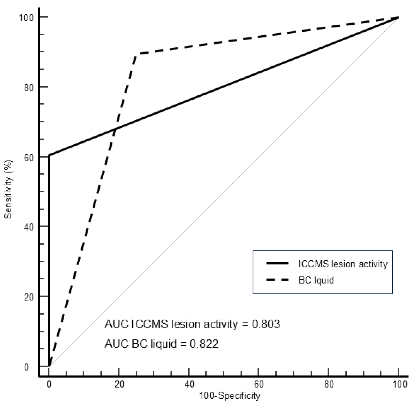 Percentage agreement between visual and BC liquid measurements was 92.6%, irrespective of activity assessment. Agreement between activity assessment and BC liquid staining was 79.6%, showing 4 false negatives and 4 false positives for BC staining. The distribution of ICCMS cross-tabulated with the BC measurement results is presented in