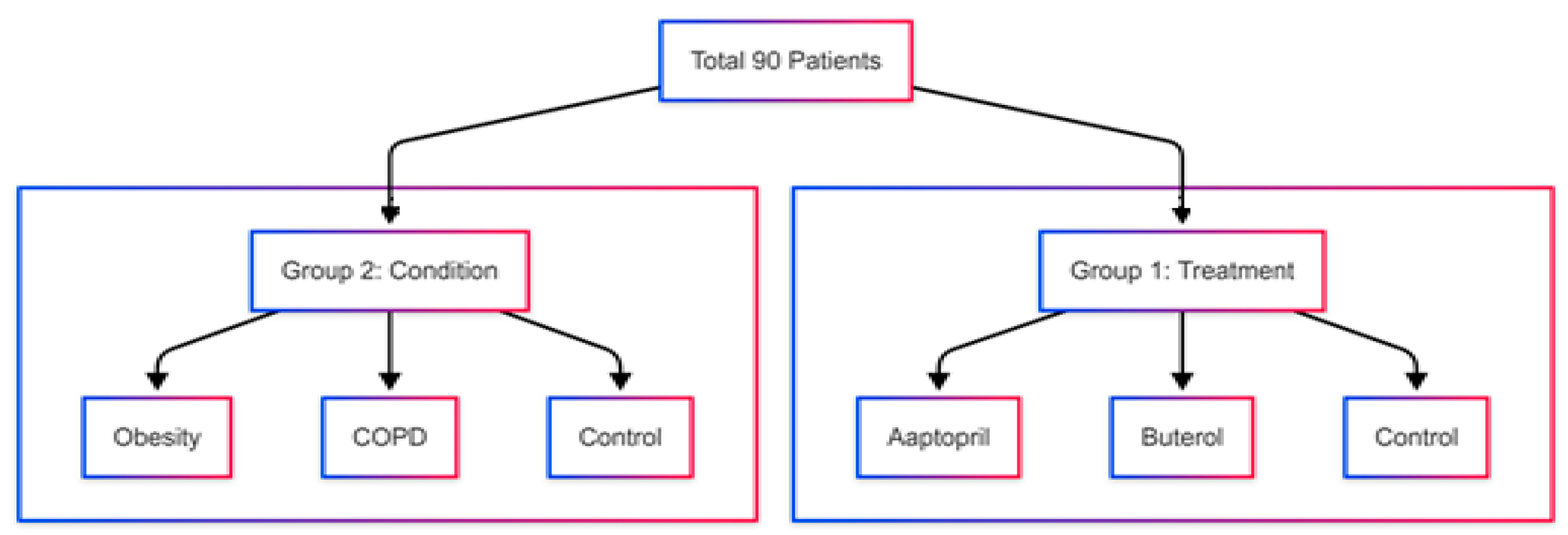 | Subgroup 1: Captopril (n = 15) | Subgroup 2: Albuterol (n = 15) | Subgroup 3: Control (n = 15) | Subgroup 1: Obesity (n = 15) | Subgroup 2: COPD (n = 15) | Subgroup 3: Control (n = 15) | ||