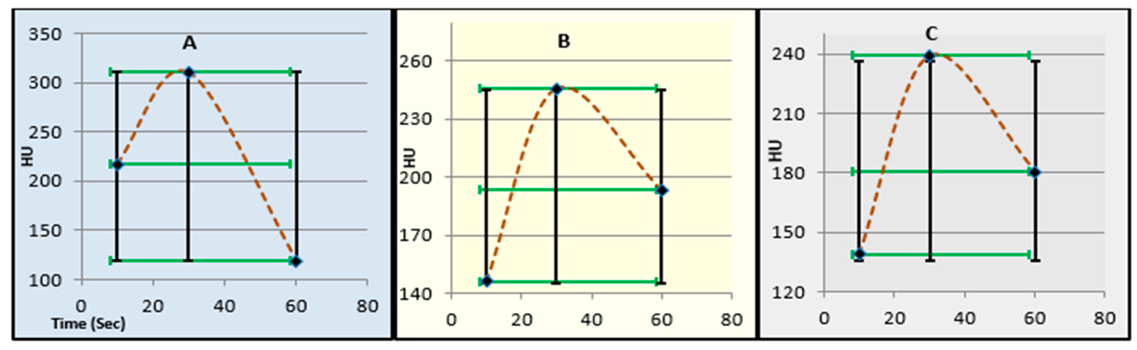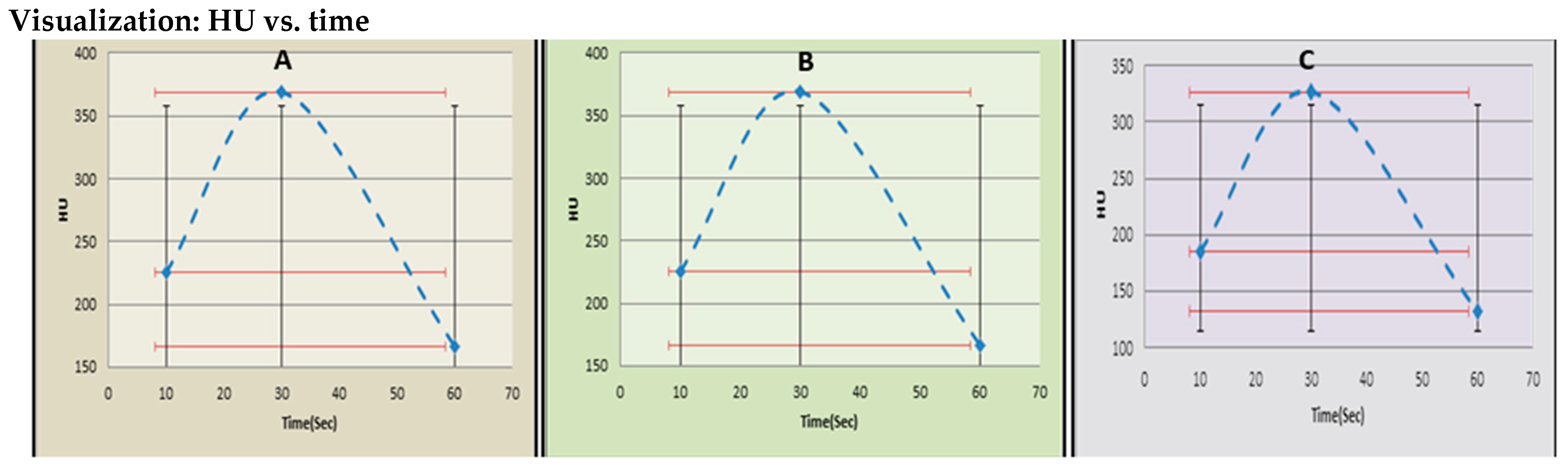| Peak HU (30 s) | 288.9 (280.1–297.7) | <0.001 | Reflects maximum contrast concentration. |