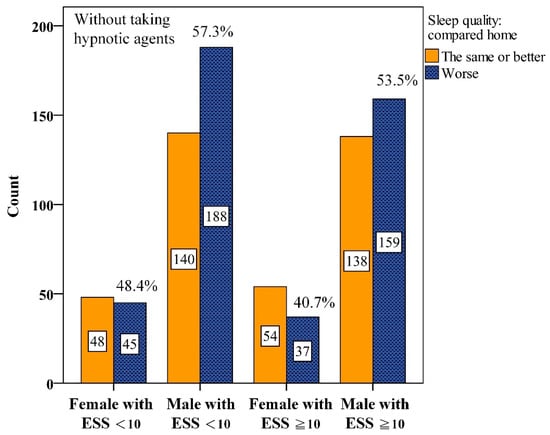 Interactions between gender and ESS were further analyzed. We found that among male participants with ESS < 10, 57.3%, worse PSQ were reported without hypnotics (Figure 2). This proportion dropped to 46.9% with hypnotics (Figure 3). Similarly, among males with ESS ≥ 10, the proportion reporting worse PSQ was 53.5% without hypnotics but dropped to 43.1% with hypnotics.