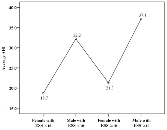 In addition, the mean apnea–hypopnea index (AHI) among men with ESS < 10 was 32.2, which was lower than that of men with ESS ≥ 10 but still remained higher relative to women (Figure 4).