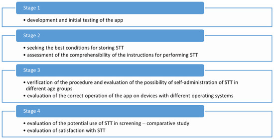 Stage 3 tested how well patients of different ages and levels of electronic literacy could self-administer the STT. Sixty subjects in each of the following age groups were asked to participate: children up to 7 years of age, school children, adolescents, adults up to 50 years of age, adults 50–60 years old, adults 60–70 years old, and adults over 70 (420 subjects in all). The subjects were asked to complete the SST in the presence of a researcher who observed the subject’s behaviour. The researchers assessed whether the instructions and messages in the app were understandable to the user, and whether any of the steps had caused problems. The tests were performed on different devices and different operating systems (MS Windows, Mac OS, Android). The correctness of the QR codes printed on the STT envelopes was also verified.