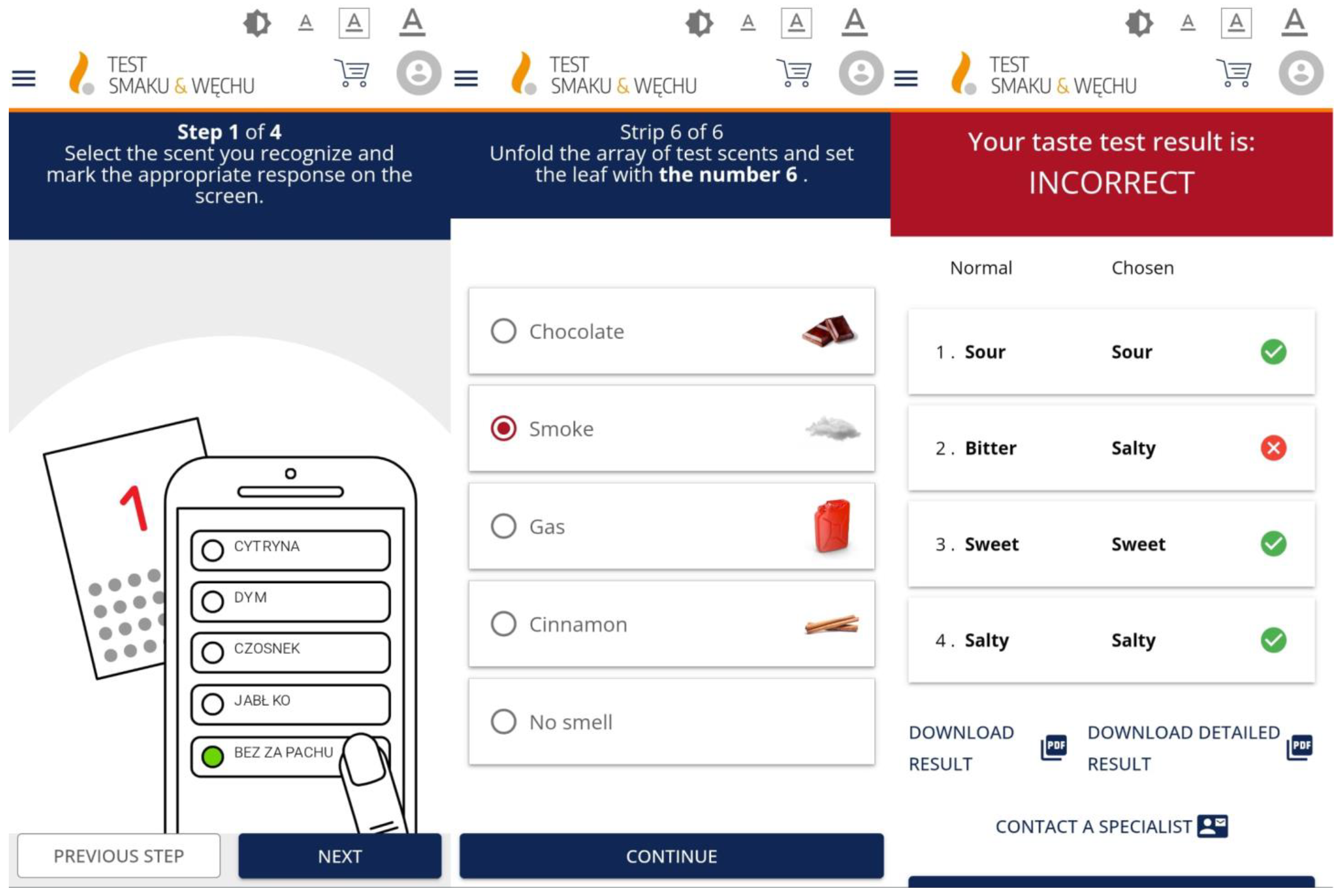 After reviewing the available literature, the feasibility of using different olfactory and taste tests in the app was evaluated, taking into account the time taken to perform a test, how well it performed, and whether it was feasible to mail the test to the patient’s home. A suitable test needed to be performed quickly and able to be performed remotely in the subject’s home without having to travel to a medical facility. Development of the app involved steps of registration, ordering, performing the STT, and read-out of results. Simple instructions for performing the STT were created using graphics to illustrate the steps involved (see Figure 2). The answer form, which appeared on the screen, contained the names of the different smells or tastes, together with icons indicating the correct answer. The result of each test included the names of the selected odour and taste. The results can be saved in pdf format. Figure 2 shows some screenshots.