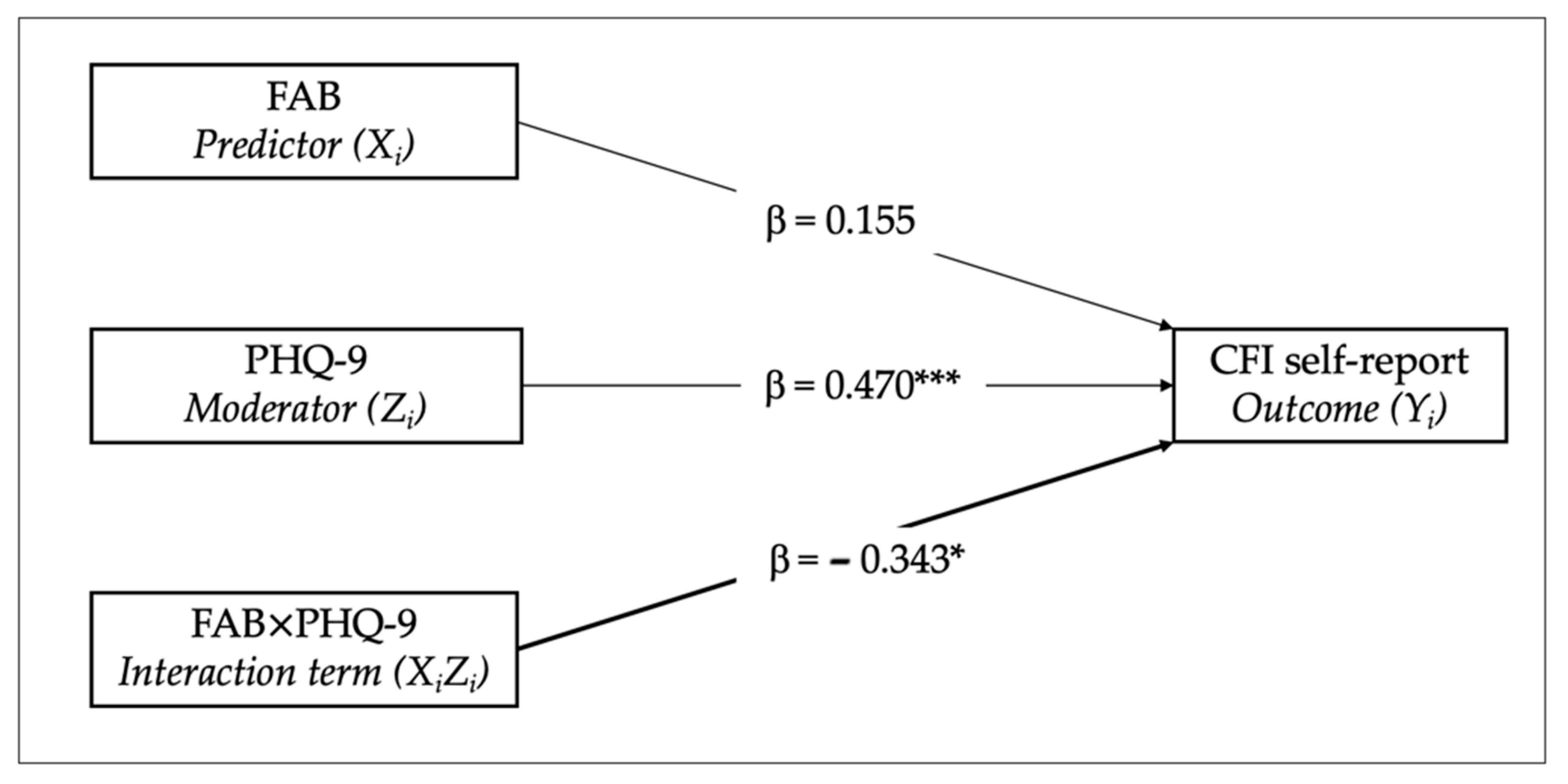 | FAB × PHQ-9 | −0.090 | 0.038 | −0.166 | −0.015 | −0.343 | −2.396 | 49 | 0.020 |