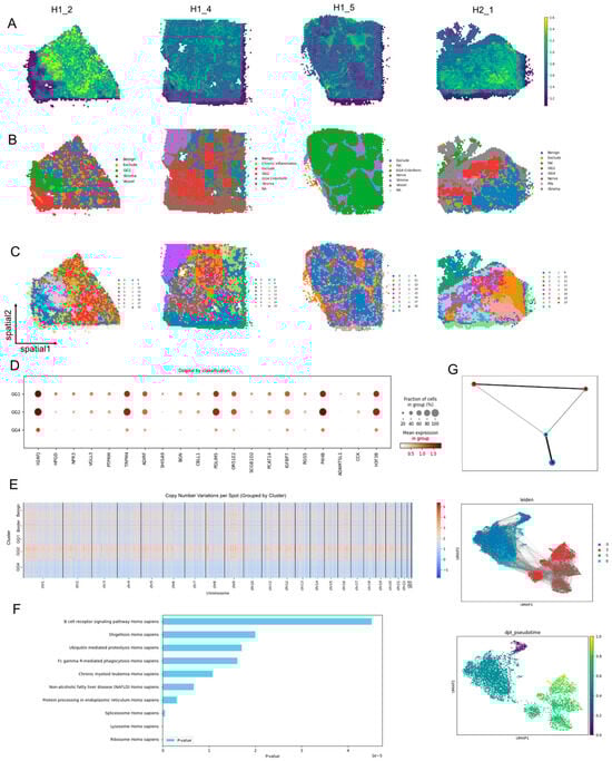 Further analyses illuminated molecular distinctions between tumor grades. Differentially expressed genes among clusters were enriched in pathways associated with tumor progression and immune modulation, including the B cell receptor signaling pathway, ubiquitin-mediated proteolysis, and chronic myeloid leukemia (Figure 5F). Chromosome-level CNV heatmaps showcased unique and shared alterations across tumor grades, providing detailed insights into genomic heterogeneity (Figure 5E).