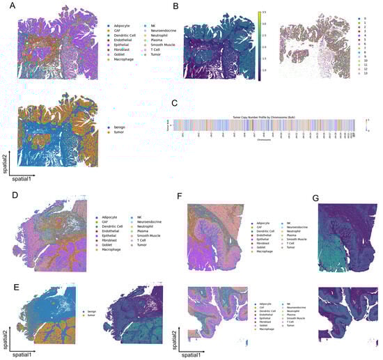 Tumor evolution, also known as carcinogenesis, is a complex, multi-step process characterized by dynamic changes in morphology, genetic composition, and epigenetic profiles [1]. Studies have demonstrated significant differences in genetic homogeneity and heterogeneity within tumors, with pronounced variations observed between malignant regions and adjacent benign tissues [2,3]. Copy number variations (CNVs), which refer to the gains or losses of specific genomic regions, are crucial for evaluating such heterogeneity and play vital roles in influencing cell proliferation, therapeutic response, and resistance mechanisms [4,5]. Traditionally, whole-genome and whole-exome sequencing have been the primary approaches for identifying CNVs, providing a broad overview of genomic alterations based on next-generation sequencing (NGS) data [6,7,8]. However, these “bulk” approaches fail to capture intratumoral heterogeneity, particularly spatial heterogeneity, which is crucial for understanding tumor progression and developing targeted therapies. Although spatially resolved DNA sequencing could theoretically address this gap [9], its practical application is limited by the scarcity and high cost of such data.