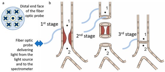 (a) Scheme of the fiber placement inside the distal end of the optical probe. The dot and crossings indicate the direction of the light transport. (b) Scheme of the surgical stages with designation of the points at which spectrometric analysis of the blood supply level was performed.