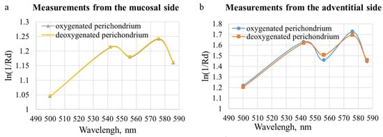 When modeling the propagation of light in tracheal tissues using six-layer prototype with varying degrees of hemoglobin oxygen saturation in the perichondrium with unchanged StO2 in the other layers, the difference in the diffuse reflectance from the adventitia side is 2.6 ± 1.7%, while the difference from the mucosa side is less than one percent. These results are shown in Figure 5. It is evident that during simulation of the fiber position on the mucosal side, the differences in the dependencies for oxygenated and deoxygenated perichondrium are practically unnoticeable. While during simulation of the fiber position on the adventitial side, the graphs visually differ with changes in perichondrium saturation. This is explained by the ratio of the layer thicknesses and the probing depth at a distance of 250 μm between the illuminating and receiving fibers (Figure 1). Therefore, to assess the condition of the fibrocartilaginous membrane, saturation measurements should be taken from the adventitia. Measurements from the lumen of the trachea provide information on the condition of the mucosal and submucosal layers.