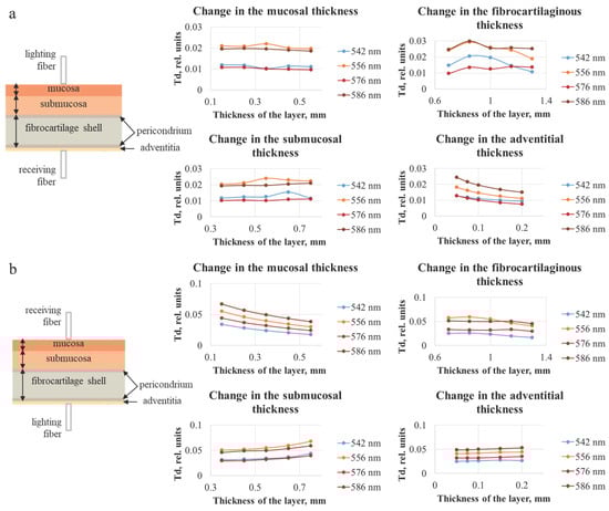 Figure 7 indicates that, with the increase in the layer thickness, the transmission either remains approximately at the same level or decreases, which can be explained by the fact that, with a larger thickness, the detected radiation must travel a longer distance, and a larger number of photons will be absorbed and scattered. In addition, analogously to the data for diffuse reflection, the results of modeling the diffuse transmission (Td) are consistent with the absorption properties of oxygenated hemoglobin. It can be seen that the layer on the side of the receiving fiber has the largest influence on the transmission signal. In Figure 7a the adventitial layer could be neglected due to its diminutive thickness (less than 0.2 mm); hence, the receiving fiber is located on the fibrocartilaginous side. In Figure 7b, this layer is the farthest from the receiver, and the highest contribution to the signal is conditioned by the change in the mucosal layer. The thickness of the fibrocartilaginous layer varies over a wider range than the thickness of the mucosa; for this reason, there is a steeper dependence of the Td signal on the thickness in Figure 7a.