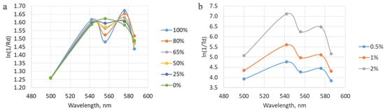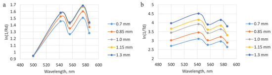Illustration of dependencies obtained after processing the modeling results, which correspond to the experimental spectra. (a) Data for different thicknesses of the fibrocartilaginous membrane with modeling of the fibers placement from the adventitial side. (b) Data for different thicknesses of the fibrocartilaginous membrane with modeling of the placement of the lighting fiber from the mucosal side.