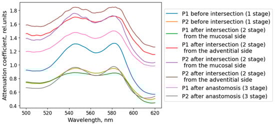 The oxygen saturation level of the microcirculatory bed of the tracheal tissues and the degree of blood filling were measured at several stages of the surgical intervention: before the trachea was transected, after the damaged part of the trachea was removed (at this stage the measurements were taken from the mucosa and from the adventitia), and after the anastomosis was created (Figure 4b). To increase the credibility of the results, at least five spectra were recorded in each area of measurement. When processing the results of the clinical measurements, the spectra related to one area of study were averaged for each of the measurement stages. Examples of diffuse scattering spectra obtained after this stage of processing are shown in Figure 10.