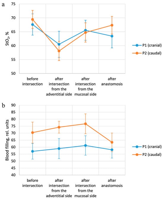 Results of intraoperative measurements. (a) Changes in StO2 values, depending on the measurement points at each stage of the operation. (b) Dependence of the blood filling level on the stage of the surgery for each examined area.