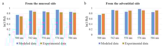 Comparison of the attenuation coefficient in diffuse reflectance geometry for modeled and experimental data. (a) Results for the fiber placement from the mucosal side. (b) Values for the fiber placement from the adventitial side.