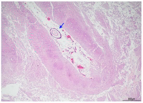 Right brain cortex: cystic leukomalacia was prominent with cortical atrophy and disrupted white matter. The blue arrow indicates a meningeal vessel showing sub-adventitial calcification (Hematoxylin and Eosin, 2 HPF).