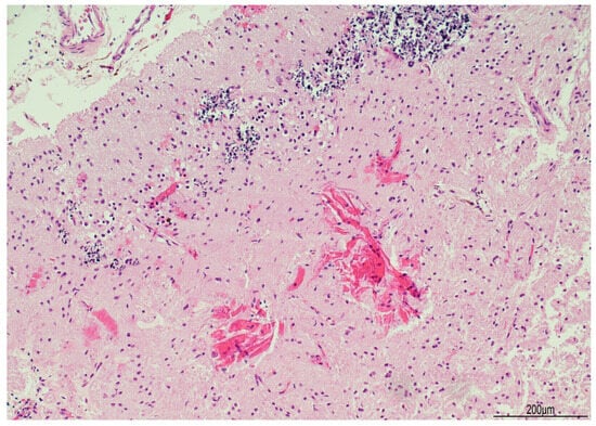 Tissue samples were formalin-fixed, paraffin-embedded, and stained with hematoxylin–eosin. Brain samples were very soft and most of the sections were disrupted after tissue processing. The brainstem showed neuronal ischemic changes, while the cerebellum showed ischemic features with Purkinje cell loss. The brain documented diffuse cortical and subcortical leukomalacia with neuronal loss, isomorphic and anisomorphic gliosis with reactive astrocytes and gemistocytes, Rosenthal fibers, and ferruginated residual neurons (Figure 4 and Figure 5). The meningeal arteries presented sub-adventitial mineralization of the tunica media and calcification of the external elastic lamina (Figure 6). Scattered microcalcifications were also found in the cerebral parenchyma as well as mineralization of the small and medium vessels. Special stains were not carried out as the histological findings were sufficiently informative for interpretation.