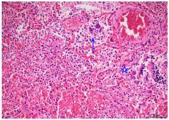 Acute pneumonia: alveoli were filled with neutrophils and bacteria (blue arrow). Bacteria were also found in bronchioles (star). Abundant erythrocytes within the alveoli were also present (Hematoxylin and Eosin, 20 HPF).