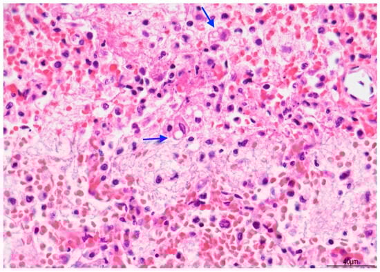 Exudative pneumonia: abundant alveolar fibrin was intermixed with lipid-laden macrophages, compatible with overlapping early lipoid pneumonia (blue arrows) (Hematoxylin and Eosin, 10 HPF).