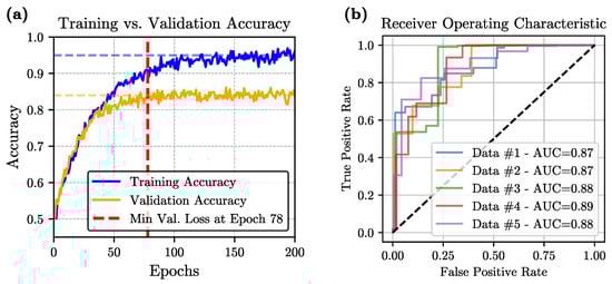 Training and Validation Performance: During training, we employed a 5-fold cross-validation strategy to mitigate overfitting and ensure robust performance. Across all folds, both training and validation losses initially decreased, indicating effective learning. However, as training progressed, an eventual increase in validation loss was observed in every fold, signaling the onset of overfitting. To address this, we adopted an early-stopping criterion based on the minimum observed validation loss, ensuring that the final model was selected at the point of best generalization rather than the end of the training process. Figure 3a illustrates the evolution of accuracy over the training epochs for one of the folds.