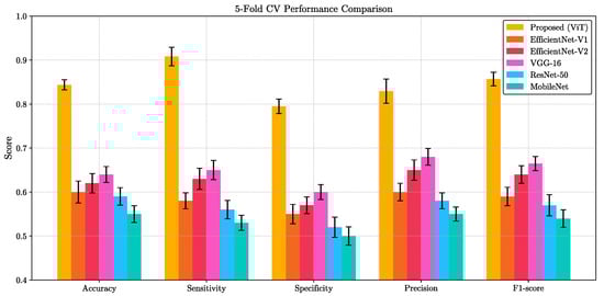 Five-fold cross-validation performance on VFSS abnormality classification for the proposed ViT and five CNN baselines (VGG-16, ResNet-50, EfficientNet-V1, EfficientNet-V2, MobileNet). Bars show mean scores for accuracy, sensitivity, specificity, precision, and F1-score; error bars denote ±1 SD across folds. The ViT attains the highest values on all metrics, with paired t-tests across folds confirming significant improvements over each baseline (p < 0.05).