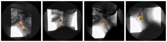 The videofluoroscopic swallowing study (VFSS) is considered the gold standard for the diagnosis and monitoring of dysphagia. VFSS involves recording video images using a fluoroscope while patients swallow foods of different viscosities, allowing physicians to observe the trajectories and kinematics of the bolus from the oral phase to the stomach [5,6,7]. These video recordings are subsequently analyzed by experts for diagnostic purposes. Each subject requires multiple recordings for each food consistency, which must be assessed frame-by-frame. Consequently, this process is labor-intensive, necessitating specialized expertise, thereby increasing the cost and reducing the availability of the examination [8].