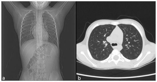 Chest CT showed no pulmonary pathology or structural vascular anomalies, as shown in Figure 2a,b, whereas abdominal ultrasound and echocardiography also revealed no abnormalities.