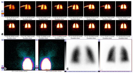 Additionally, pulmonary perfusion scintigraphy was performed to assess regional pulmonary blood flow and to exclude ventilation–perfusion mismatch. The technetium-based radiopharmaceutical demonstrated uniform distribution throughout both lungs, with no focal perfusion defects. Images were obtained in the anterior and posterior projections 4 s after injection and in the frontal projection 300 s after injection, confirming homogeneous perfusion and the absence of regional abnormalities, as shown in Figure 3a–c.