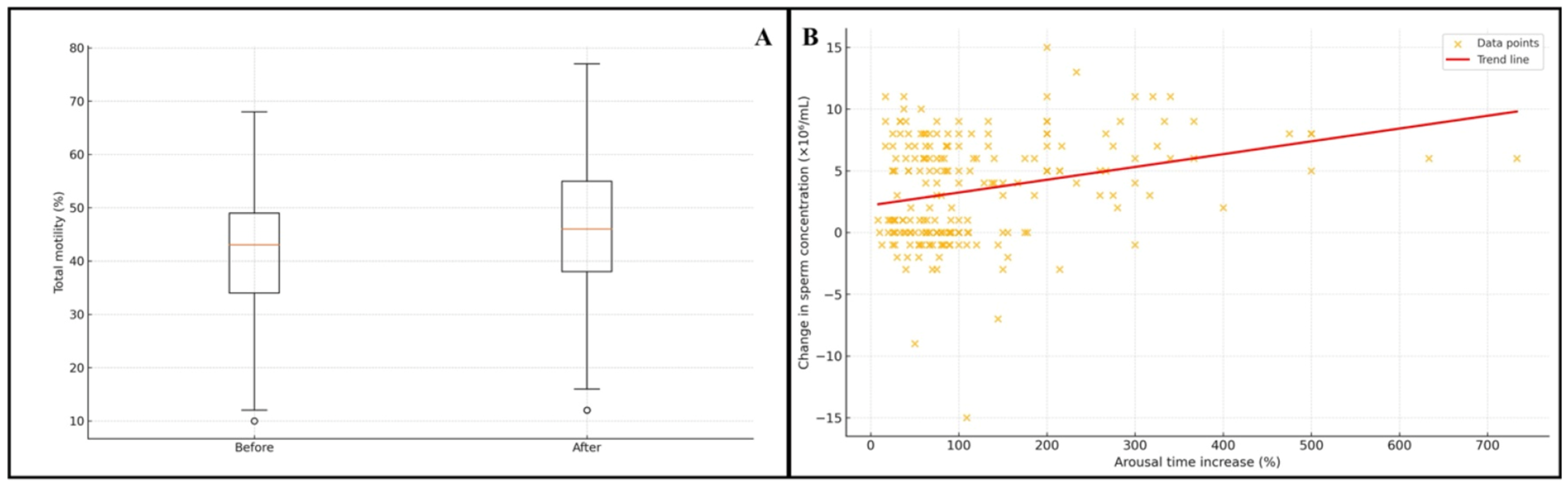 Spearman correlation analysis revealed weak but statistically significant positive associations between the magnitude of arousal time increase and changes in sperm concentration (ρ = 0.209,