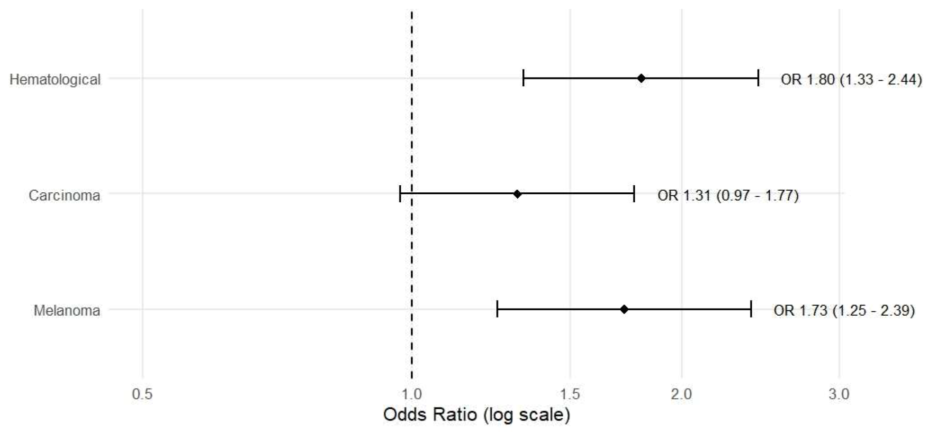 | Variables | Hematological (n = 361) | Carcinoma (n = 826) | Melanoma (n = 13) | Sarcoma (n = 113) | p-Value | Effect Size () |