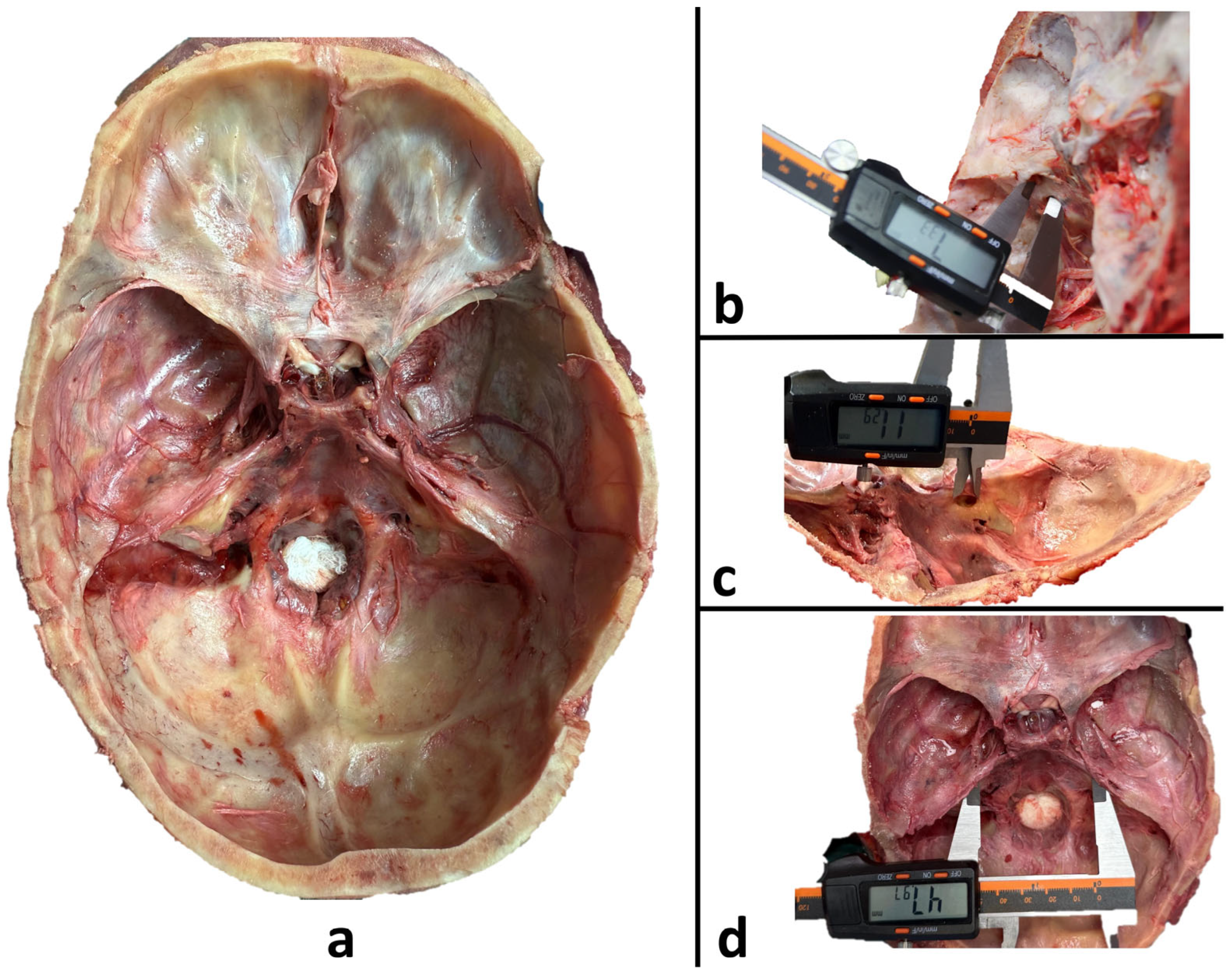 - Tellioglu, A.M.; Durum, Y.; Gok, M.; Karakas, S.; Polat, A.G.; Karaman, C.Z. Suitability of foramen magnum measurements in sex determination and their clinical significance. Folia Morphol. 2018, 77, 99–104. [Google Scholar] [CrossRef]