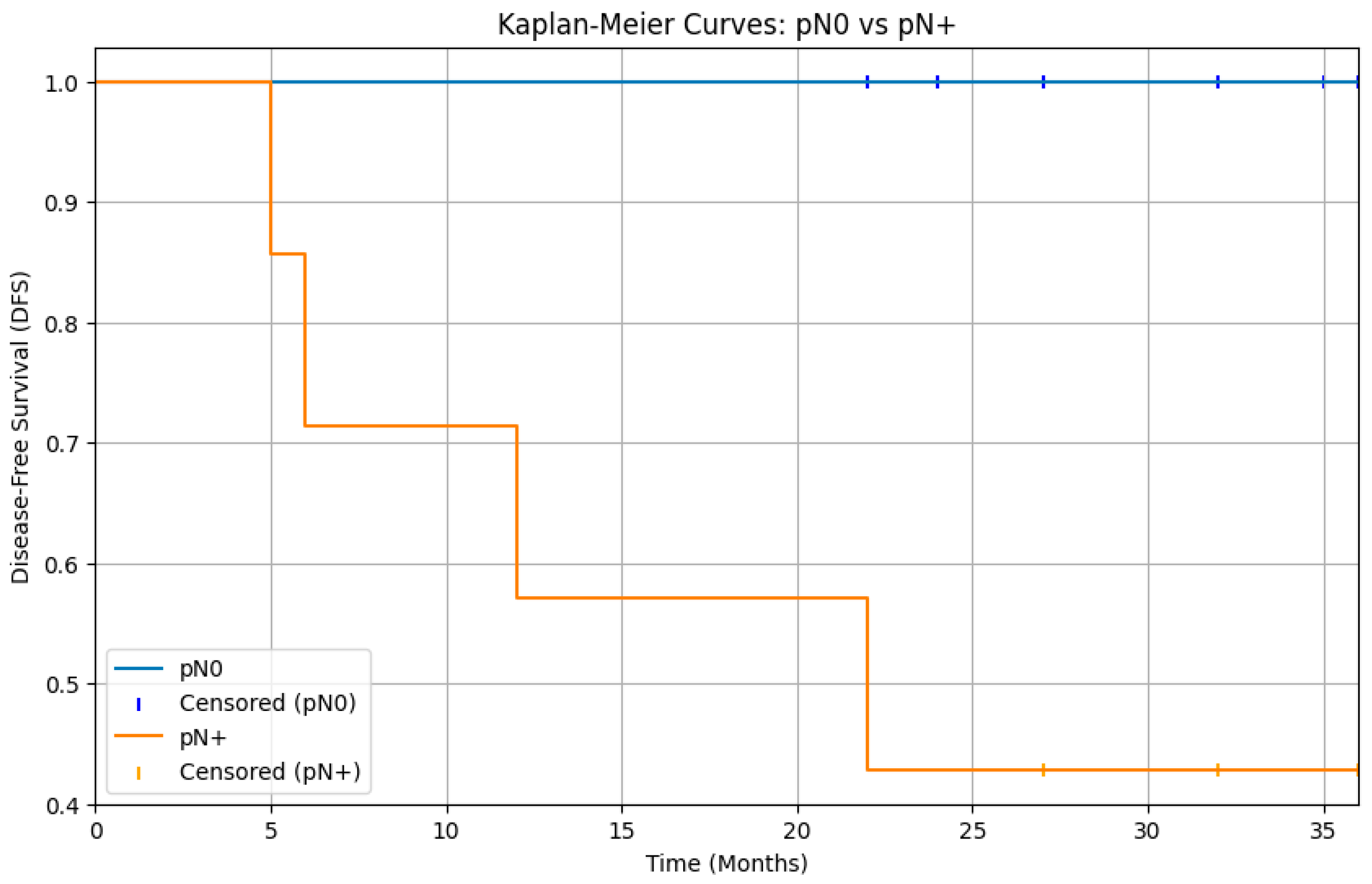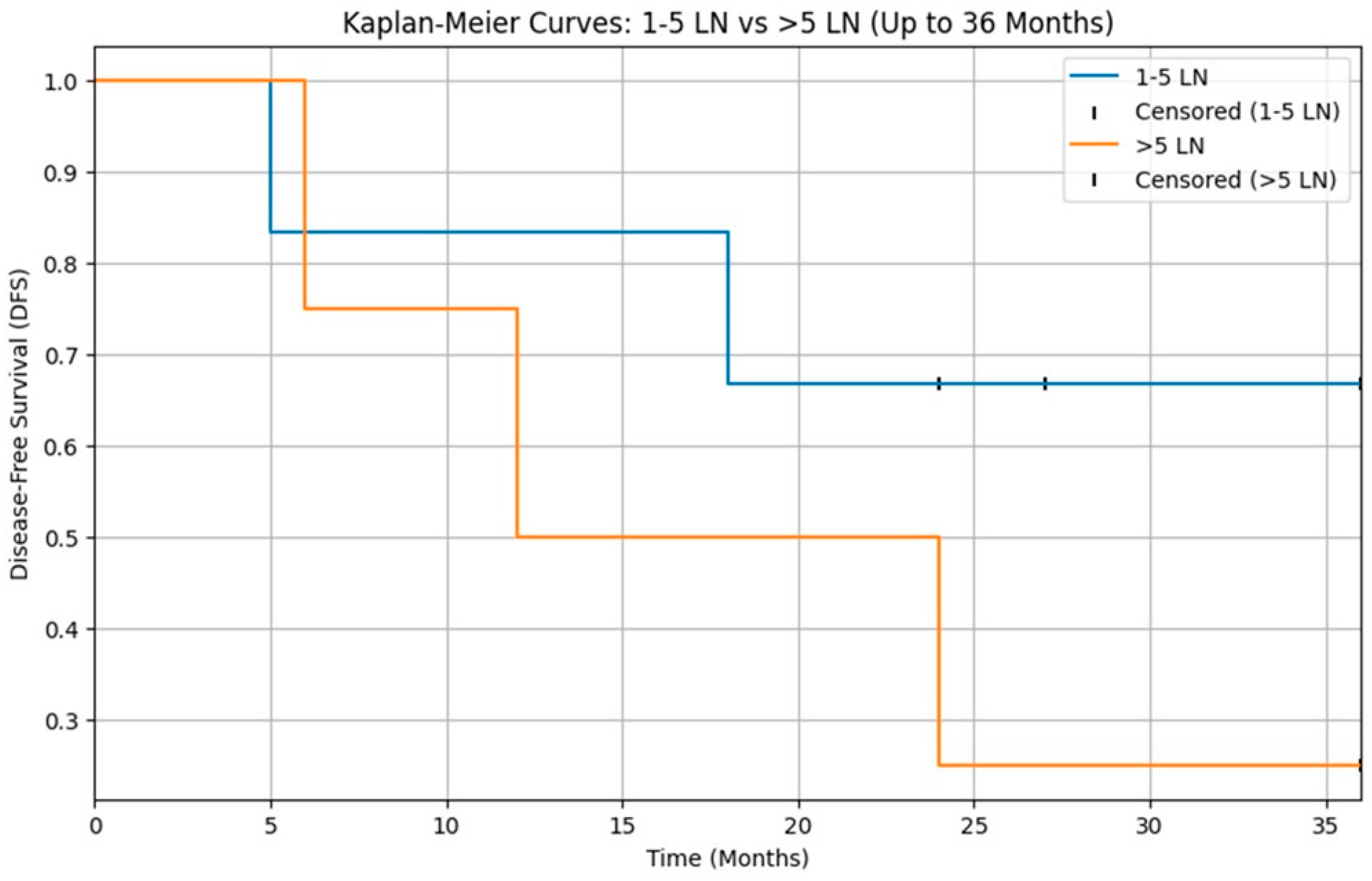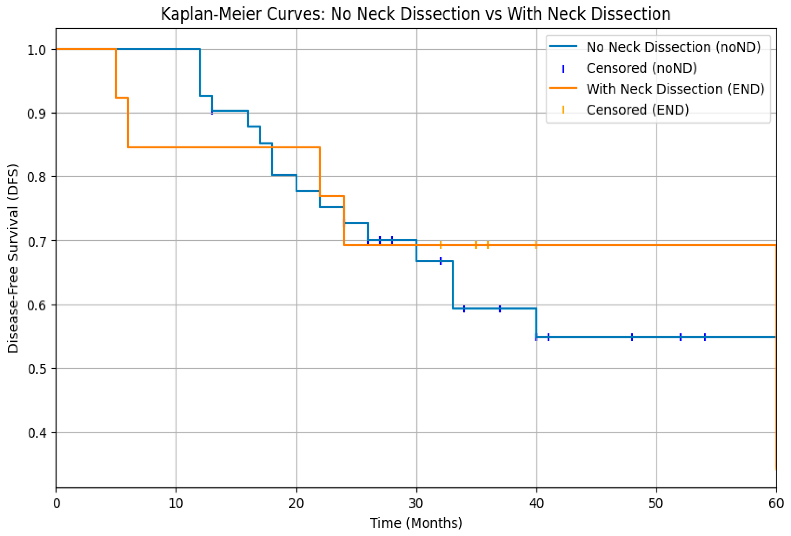 - Elective Neck Dissection: Conducted on patients considered at elevated risk for occult metastatic disease, this approach aims to pre-emptively address potential nodal involvement. Patients considered at elevated risk were those with locally advanced (cT3-T4) tumors and high-grade histology (in this context, high-risk histologies predominantly include squamous cell carcinoma, adenocarcinoma, undifferentiated carcinoma, high-grade mucoepidermoid carcinoma, salivary duct carcinoma, and adenoid cystic carcinoma) [11,12,13].