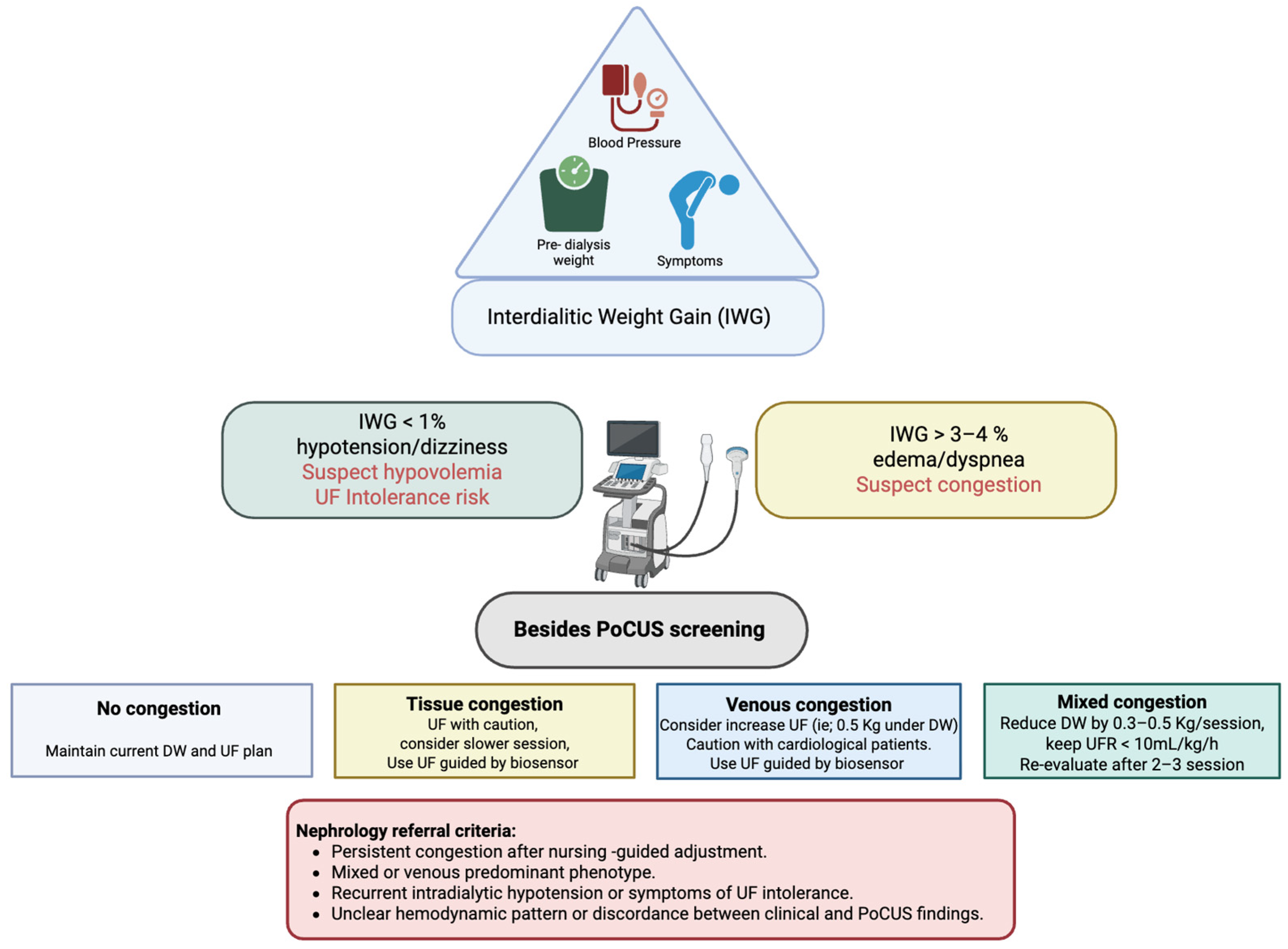 - Predominant venous congestion: Use progressive decompression rather than aggressive UF; refer for cardiac PoCUS to evaluate right ventricular function.