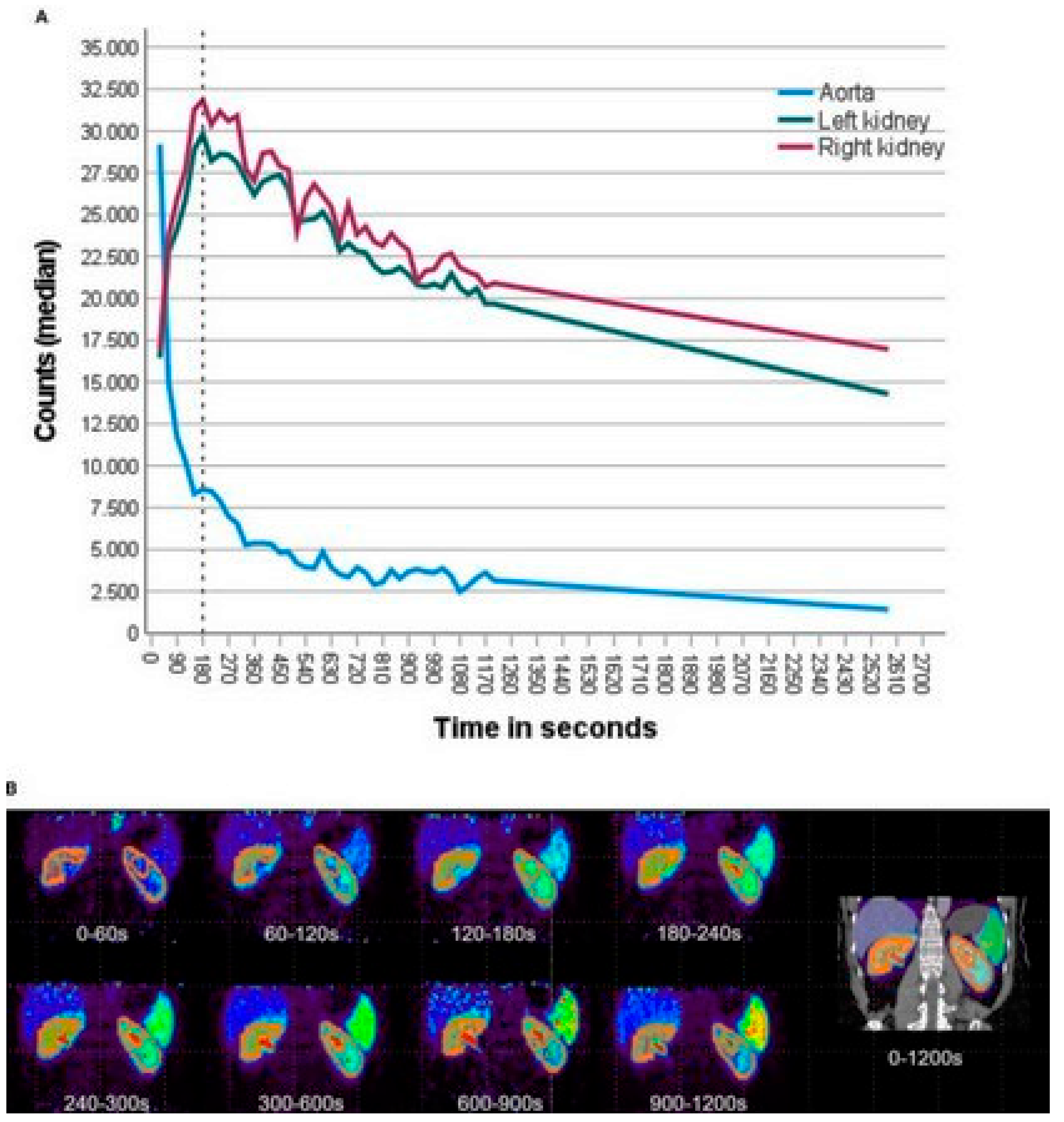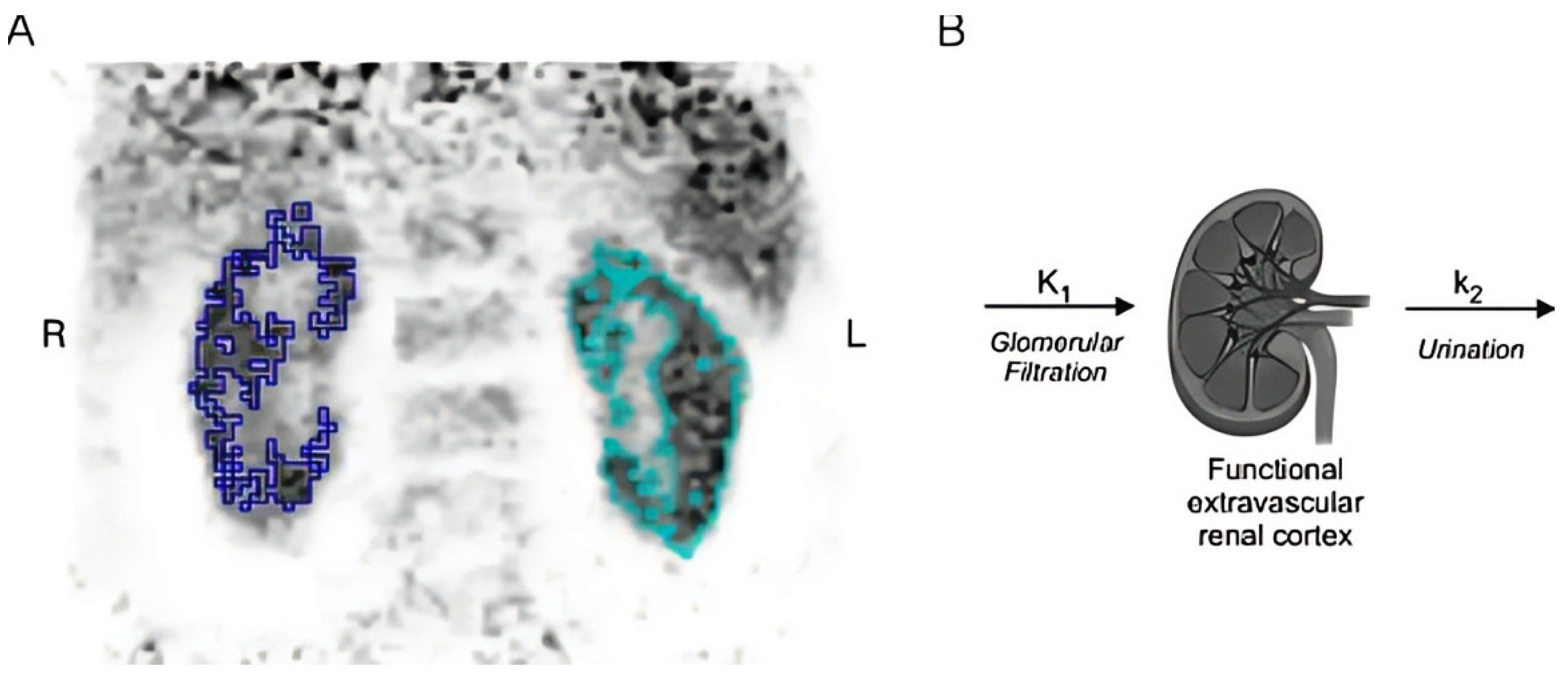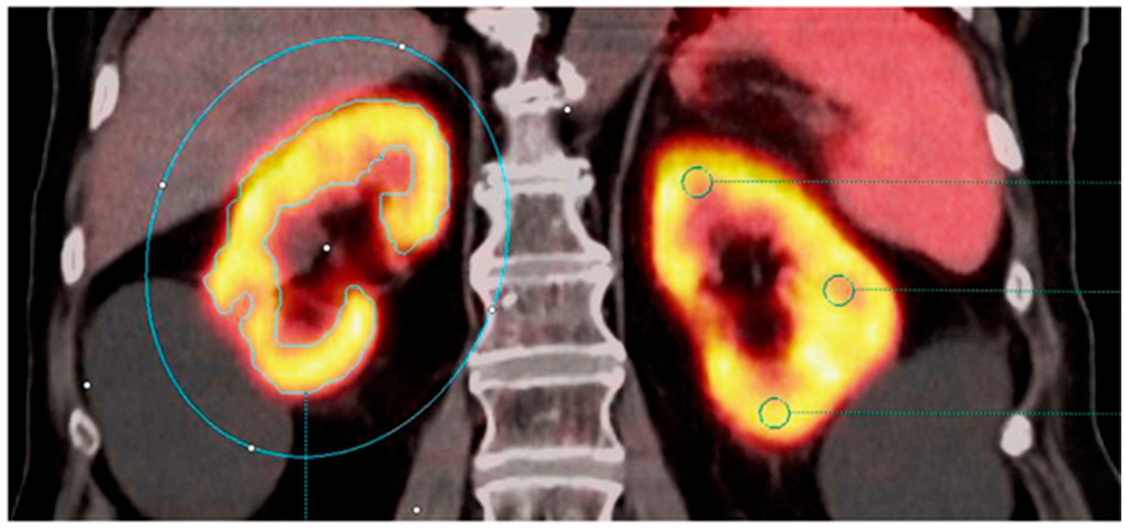- Kersting, D.; Sraieb, M.; Seifert, R.; Costa, P.F.; Kazek, S.; Kessler, L.; Umutlu, L.; Fendler, W.P.; Jentzen, W.; Herrmann, K.; et al. First Experiences with Dynamic Renal [68Ga]Ga-DOTA PET/CT: A Comparison to Renal Scintigraphy and Compartmental Modelling to Non-Invasively Estimate the Glomerular Filtration Rate. Eur. J. Nucl. Med. Mol. Imaging 2022, 49, 3373–3386. [Google Scholar] [CrossRef]