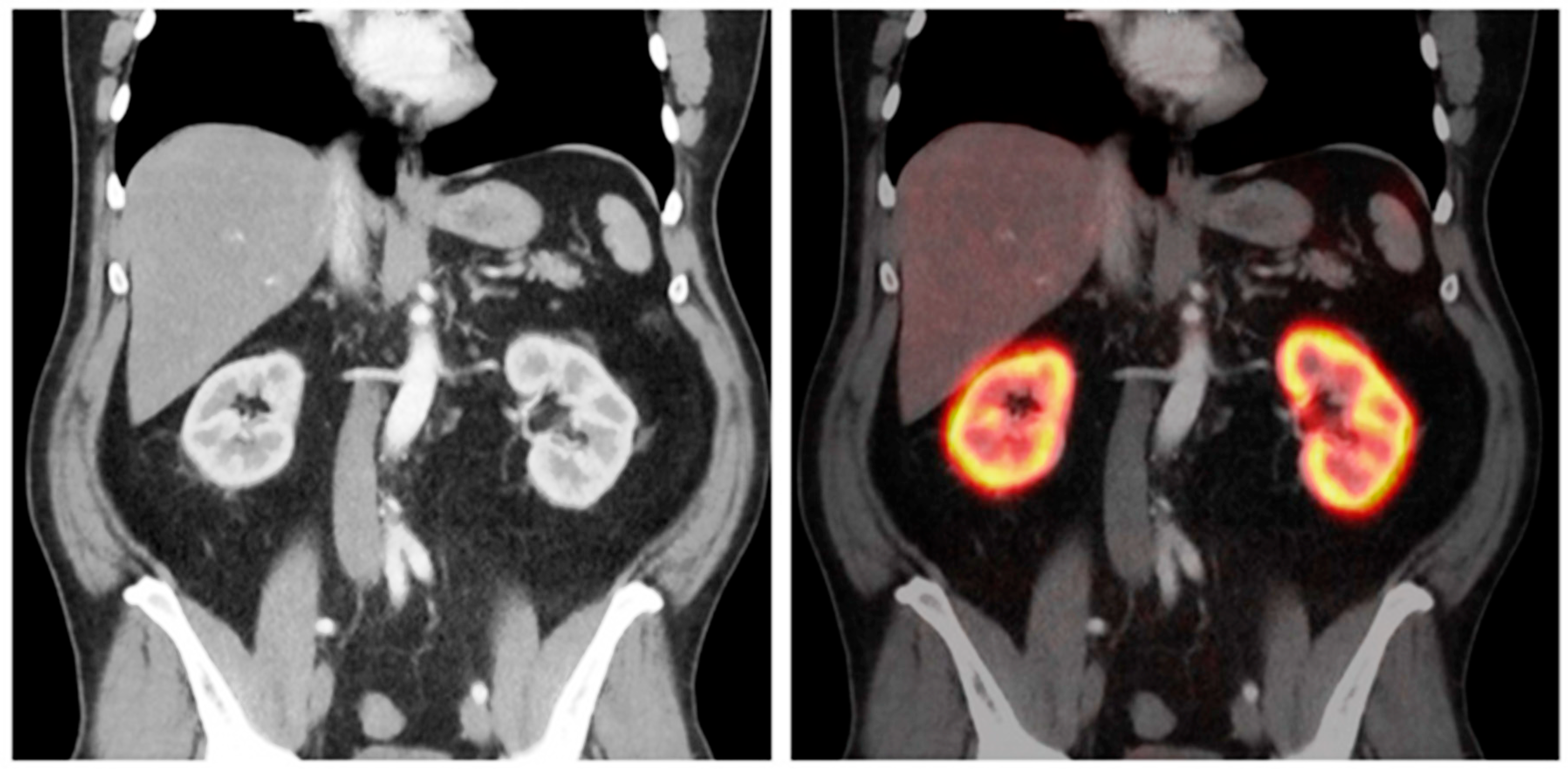 | 18F-FDG | Fluorine-18 | Widely available PET tracer, not renal specific | Dynamic PET/MRI showed correlation with GFR (r = 0.88), effective renal plasma flow estimation | Dual-purpose oncologic and renal function imaging | Indirect reference method, limited in renal pathology |