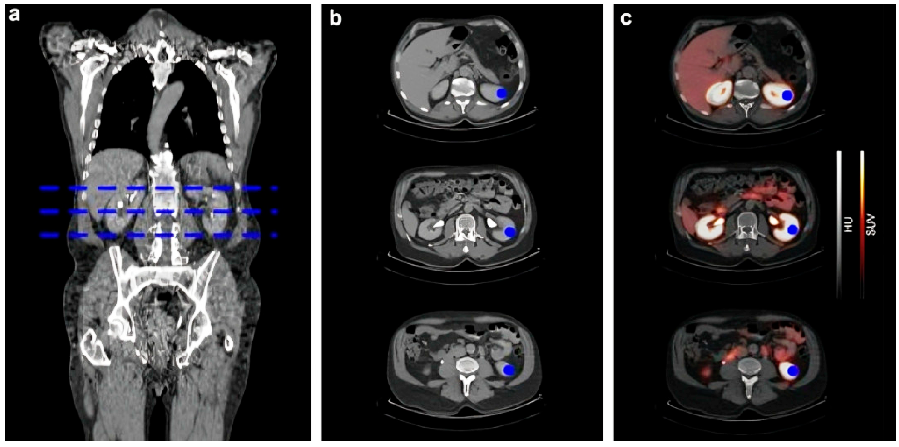 - Weissinger, M.; Seyfried, K.C.; Ursprung, S.; Castaneda-Vega, S.; Seith, F.; von Beschwitz, S.; Vogel, J.; Ghibes, P.; Nikolaou, K.; la Fougère, C.; et al. Non-Invasive Estimation of Split Renal Function from Routine 68Ga-SSR-PET/CT Scans. Front. Med. 2023, 10, 1169451. [Google Scholar] [CrossRef]