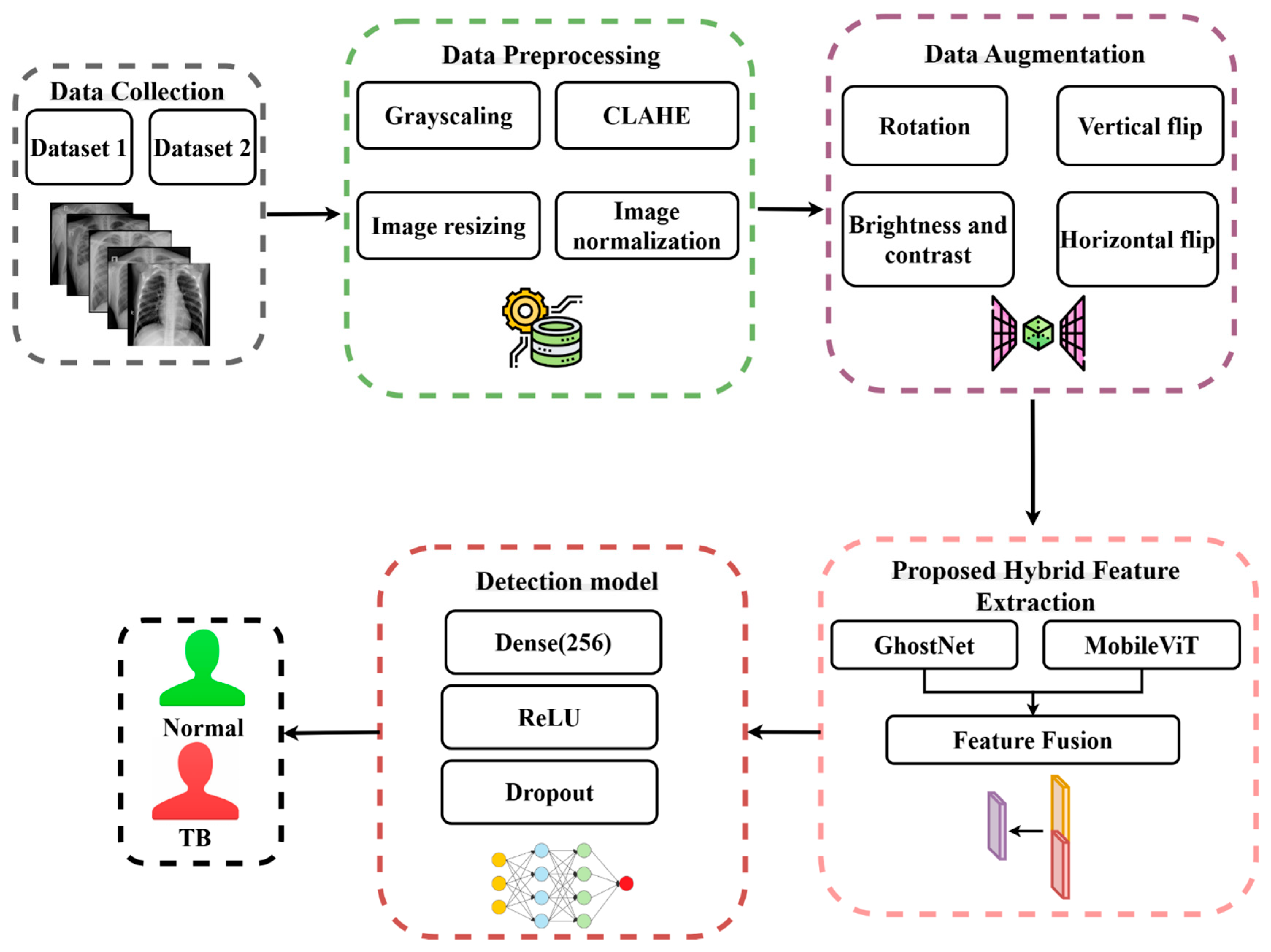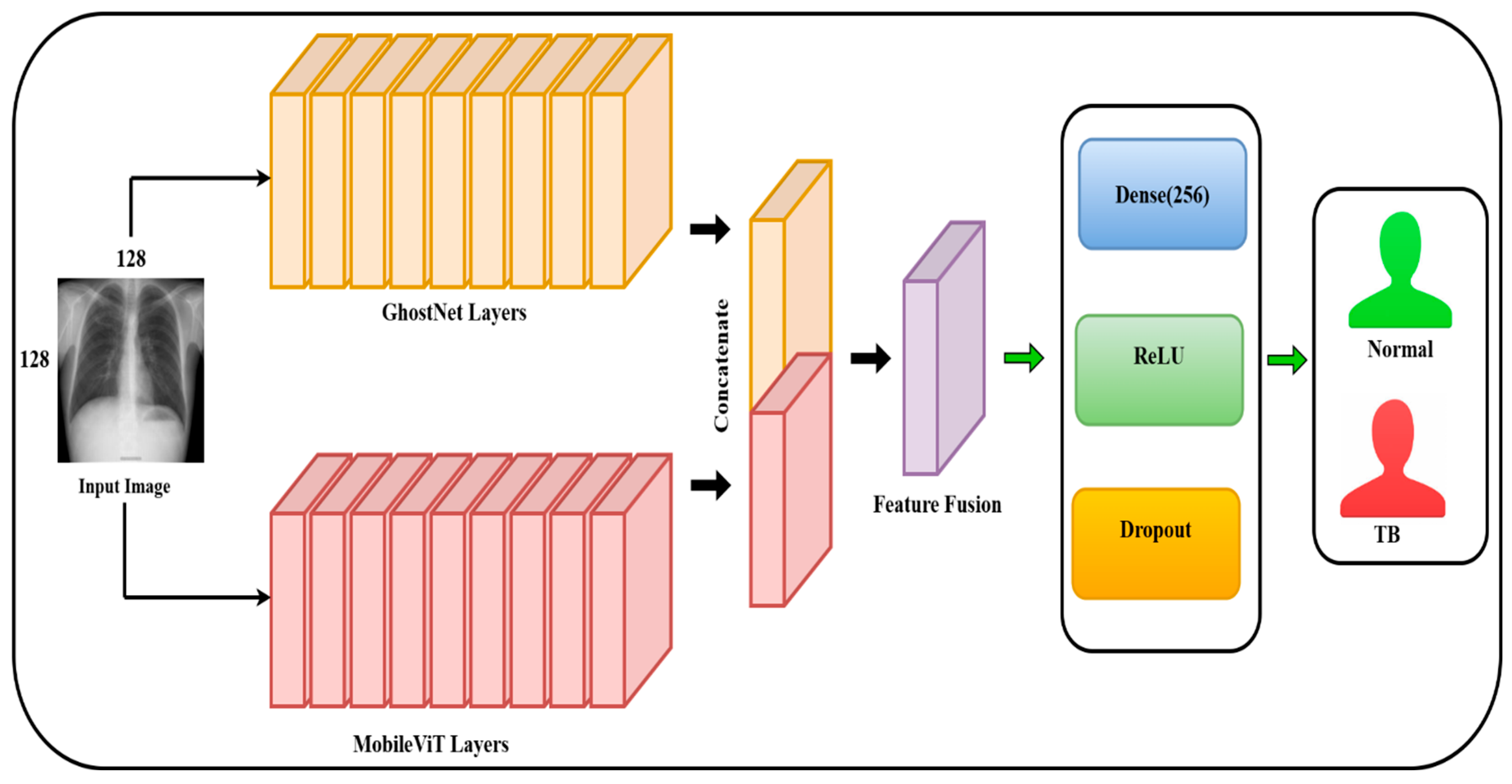 - Development of a Hybrid Deep Learning Model: A novel hybrid deep learning approach is introduced by combining GhostNet, a light-weight CNN, with MobileViT, a transformer-based model. The combination leverages the power of both local feature extraction (CNN) and global context modeling (transformers) for more accurate TB classification.