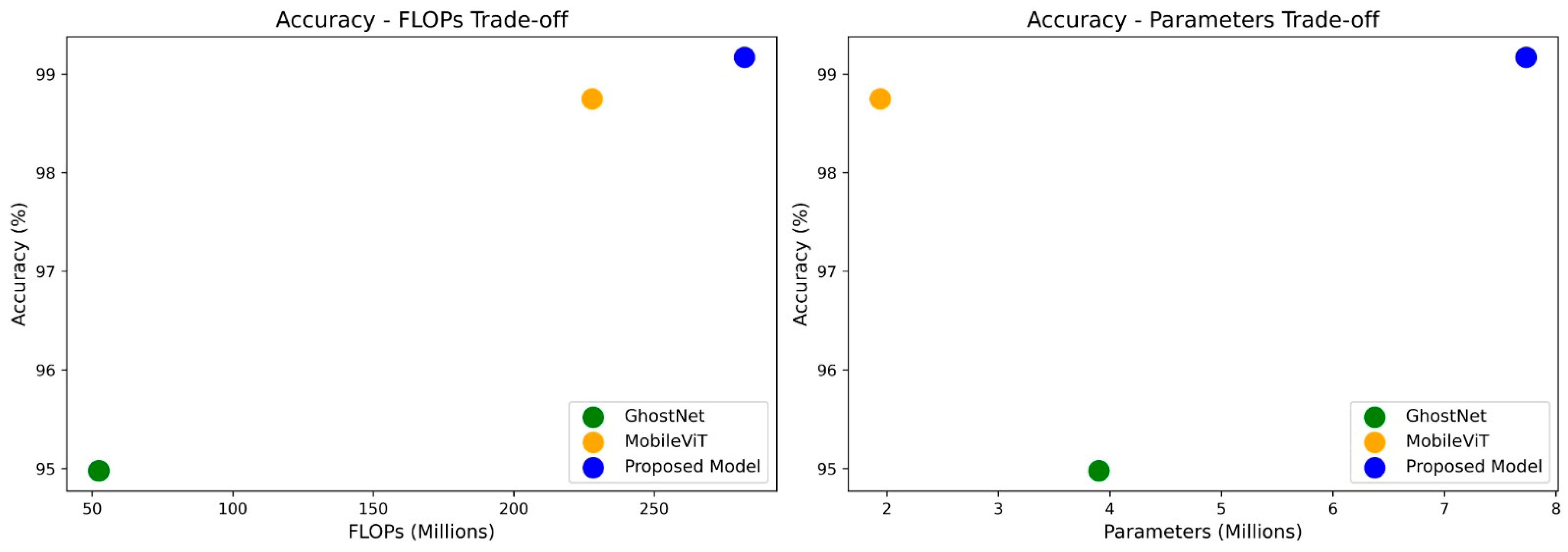 - Balanced Trade-Off Between Efficiency and Performance: The introduced model attains high diagnostic accuracy (up to 99.52% accuracy) while preserving computational efficiency (just 7.73 million parameters and 282.11M Floating Point Operations (FLOPs), superior to most state-of-the-art models.